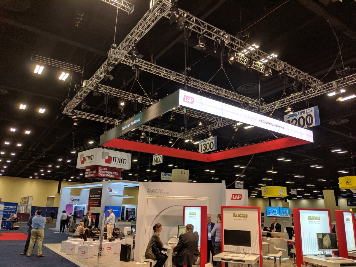 Below, see another application of the video tiles when LAP Laser rented a 7m x 7m x 0.5m suspended video header 6m in the air at a recent show in San Antonio, Tx! Another key feature of our new video tile inventory is the ability to apply an SEG fabric graphic on the back side of the video tile, thereby hiding all cabling and giving an opportunity to place a branded message on the back side of your video wall. LAP Laser opted for a solid red background in the application below, but this could be printed as a full colour image as well!