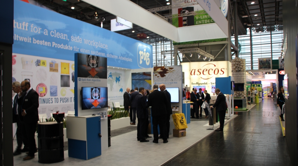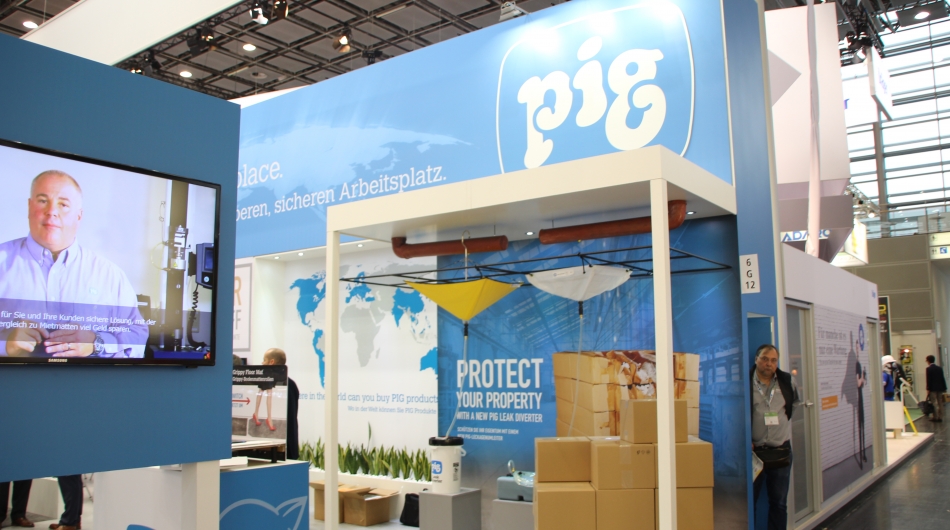 Specializing leaks, drips and spills, New Pig had not attended A+A in Dusseldorf for nearly 10 years. They needed to create a big impression and ensure they established a brand recognition within the European marketplace. New Pig wanted to be able to have multiple product demonstrations, give away product samples and promotional items, and run multiple videos within the booth to demonstrate product use situations. Private meetings were less important than the ability to have several meetings at once.