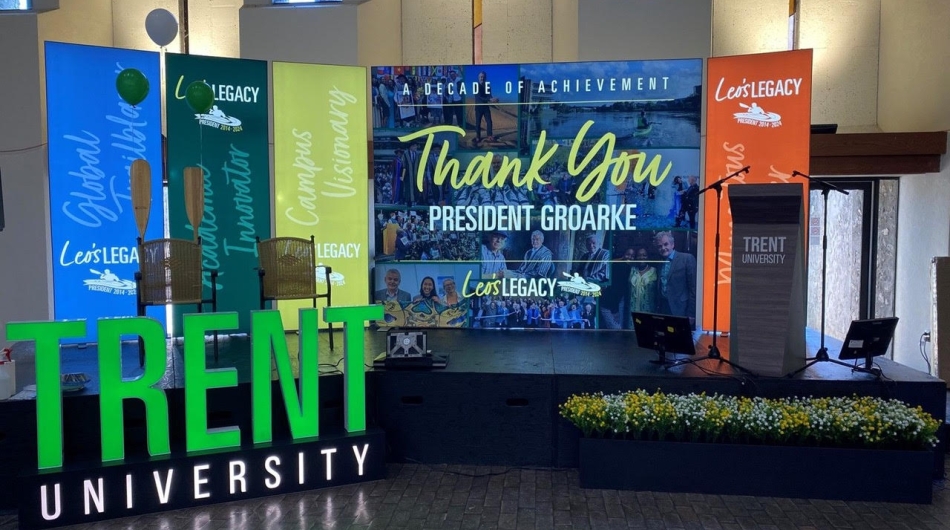 Design a flexible, impactful setup for the President’s retirement event at Trent University, while creating elements that could be reused for future events. The design needed to incorporate modern LED components, a custom arch, podium options, stand-alone custom letters, and other elements reflecting Trent’s identity, maintaining a professional and celebratory atmosphere.